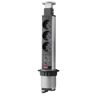 Выдвижной блок РОР-UP 11.103.09.012 (артикул G14641) помимо трех EURO розеток дополнительно оснащен двумя входами USB, для удобной зарядки беспроводных наушников, внешних аккумуляторов Power Bank, смартфонов и другого оборудования. Основание корпуса изготовлено из алюминия, а его торцевая часть и розетки произведены из прочного пластика. Благодаря порошковой окраске корпус не подвержен истираниям и появлению царапин, что позволяет ему длительное время сохранять первоначальный внешний вид.